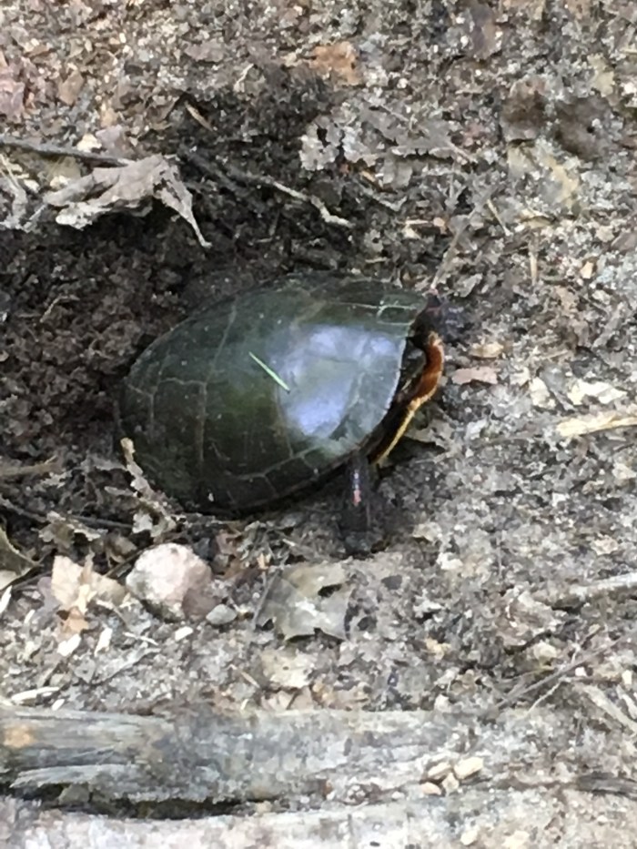 On the other side of the lake, Leia and I came upon a box turtle squatting in a shallow hole. She was laying her eggs.
